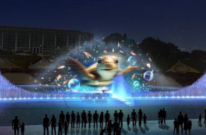 1つ目は、国内最大級の「ウォータースクリーン大噴水ショー」。期間限定で夜間に行われる、噴水上で行われるイベントなんです。噴き上がる水の中に投影される愛らしいキャラクターたちと音楽で魅せる迫力満点のショーは一見の価値あり◎