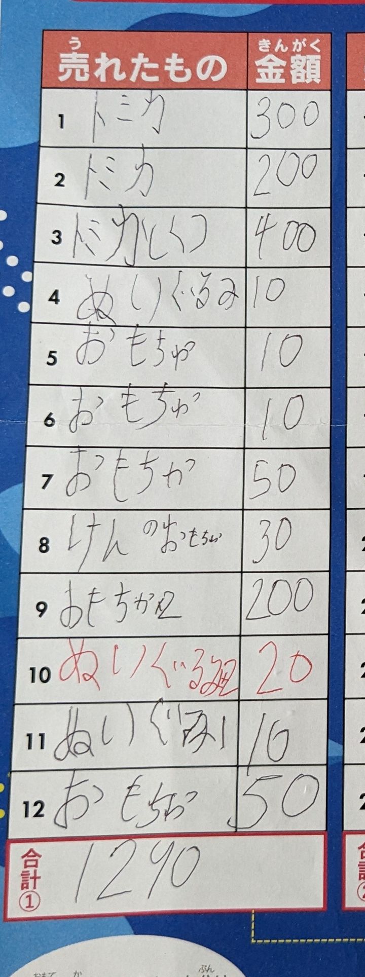 早速貯金箱に売上金を入れる長男。今までの長男なら貯金箱に入れた翌日には「やっぱりお菓子買うからお金出す~」とすぐにお金を使ってしまっていましたが、今回はまだ貯金箱に入ったまま。長男の中では【自分で稼いだお金】を大切にしたい気持ちが強いようで、今まではあるだけ全て使っていたお小遣いも使い道を考えながらお金を使っているように見えます。