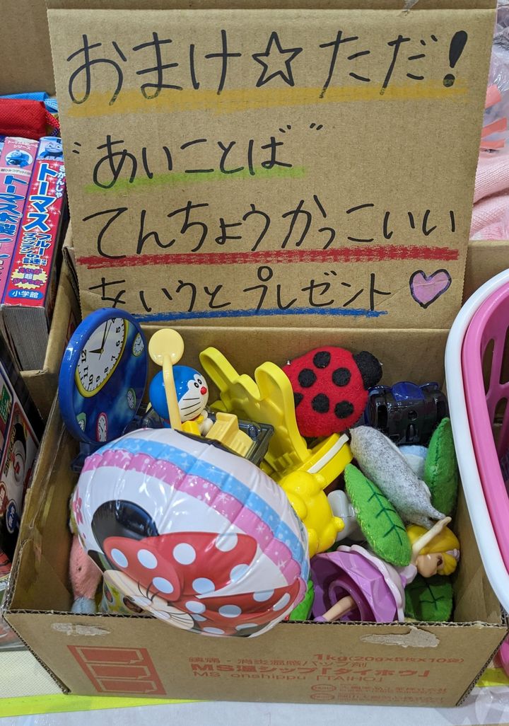 百円玉3枚を受け取り「ありがとうございました」と元気にお礼を言う長男。売れるか少し心配していたようですが、開始してすぐに自分のおもちゃが売れたことが自信に繋がったようで、その後も元気に良く通る声を沢山出して店長として頑張っていました!!