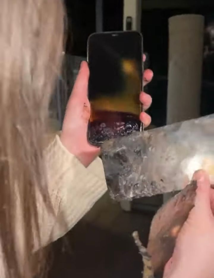 炭火がついたBBQコンロの中から拾い上げられたiPhone。