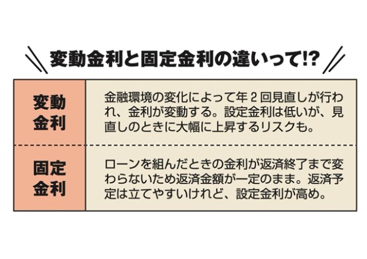 住宅ローンを変動金利にするか固定金利にするかに関してはいろいろな意見があるけれど、今なら変動金利で年0.3%、固定金利だと1.8%だったりして1.5%も違うから(金利は金融機関によって異なる)、ぶっちゃけ変動でいいんじゃない!?もちろん、今後は上がる可能性もある。どうしても手堅くいきたい人だったり、長く住む予定なら固定金利を選んでもいいのかも。これに関しては、正直正解はない。どちらを選ぶかはその人の生き方次第だね。