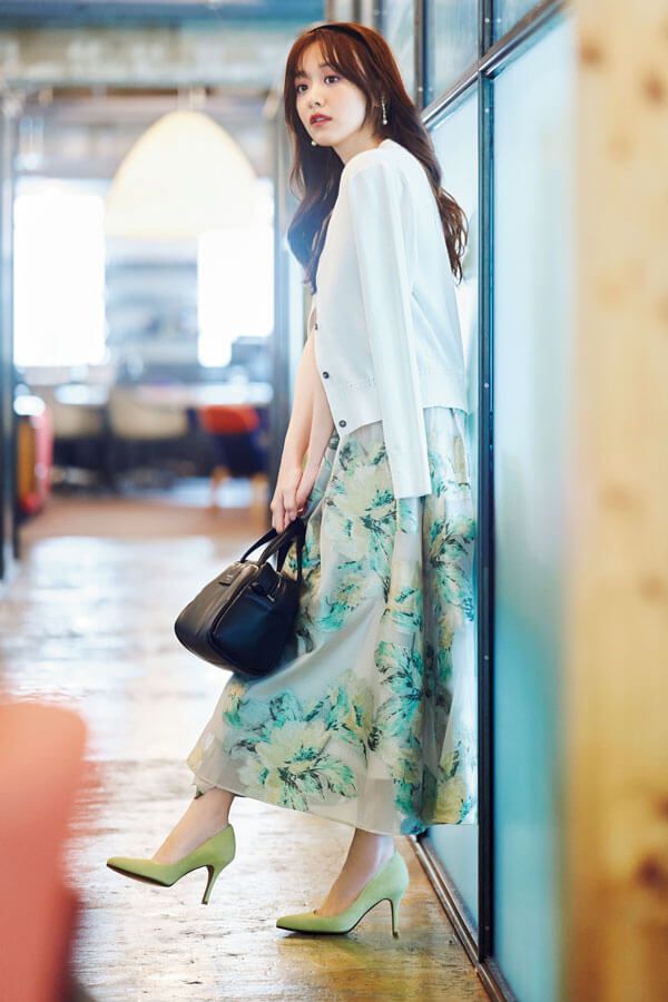 華やぎたっぷりなスカートは、正統派のカーデでバランスをとって。スカートの色とリンクさせたきれいパンプスでセンスの良さをアピール♪