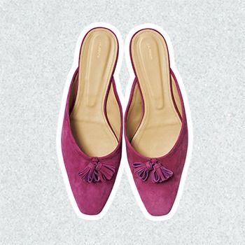 スエードパープルタッセルミュール(1) 39,600円/ロランス(ザ・グランドインク) ヴィヴィッドなカラーをなごませる起毛感のあるスエード。タッセルもちょうどいい飾りに。