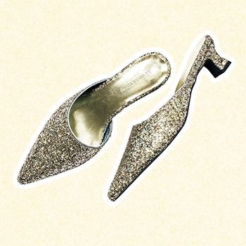 甘い装飾やグリッターなど、ドレッシーなデザインも過度にならないのは、かかとが抜けたミュールだからこそ。ドレスアップした足元も力みがなく抜け感も宿る。脚を短く見せないポイントは「甲は浅め、先は細く、全体のフォルムは細長い」もの。