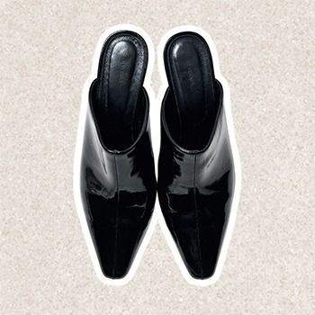 黒エナメルポインテッドミュール(4.5)16,500円/ル・ベルニ(キャセリーニ) 足先まですらりとした細身のフォルムでスタイルアップを促す。黒の重厚感を光沢で調整。