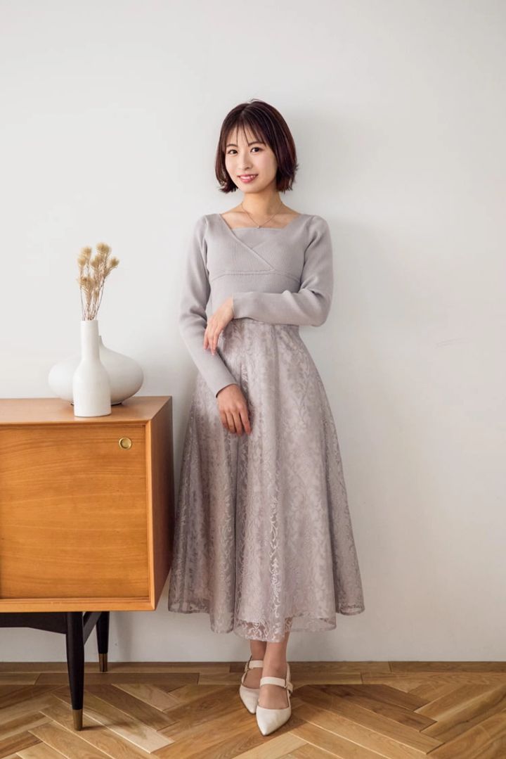 仕事向きな上品シンプルワンピはスカートの丈感やレースが理想的バランス