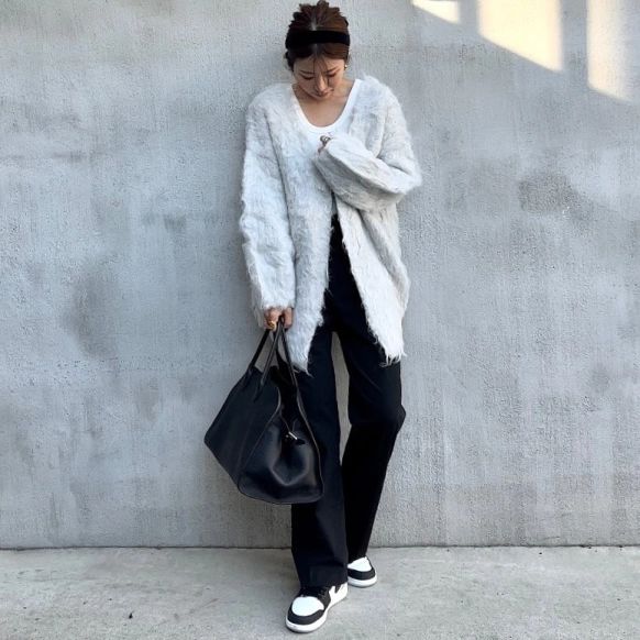 白のTシャツに、ロングカーディガンを合わせて体型カバー。ロングカーデは脱ぎ着できて、春夏の変わりやすい気温にも対応しやすいアイテムです。ボトムスには、ユニクロのタックワイドパンツをチョイスしています。黒を選ぶことで細見え効果も◎髪をアップすることで顔周りもすっきり見えますね。