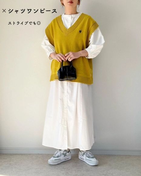 白のワンピースにトレンドのニットベストを合わせて垢ぬけた印象に。ベストは、動きやすく温度調整もしやすいので、運動会にもおすすめです。足元にスニーカーを取り入れることで、動きやすさも叶います。