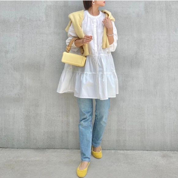 白のティアードワンピースにデニムを合わせた大人ジュアルコーデ。カーディガンとバッグ、足元には春におすすめの黄色を取り入れています。競技参加がない場合には、おしゃれなフラットシューズをコーデのポイントにするのもいいかもしれません。