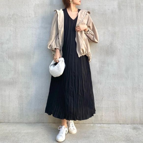 黒のワッシャープリーツワンピースにベージュのブルゾンを合わせた高見えコーデ。ワッシャープリーツ生地は、動きやすさはもちろん、しわにもなりにくいのがうれしいポイントです。足元は白のスニーカーで爽やかにまとめています。