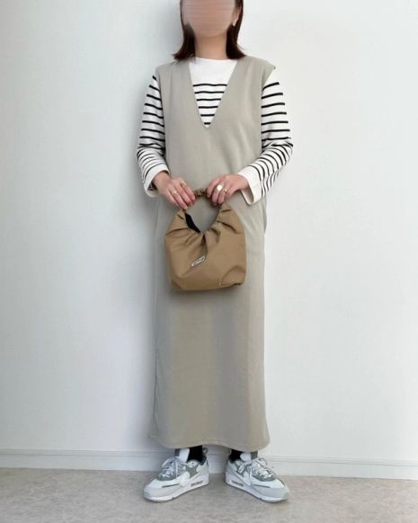 Vネックジャンパースカートとボーダートップスを組み合わせたカジュアルコーデ。深めVネックのIラインジャンパースカートは、上半身をすっきり見せ、ウエスト位置が隠れるため脚長効果も抜群です。ボーダーやスニーカーなどのアイテムでカジュアルダウンさせれば運動会コーデにもピッタリです。