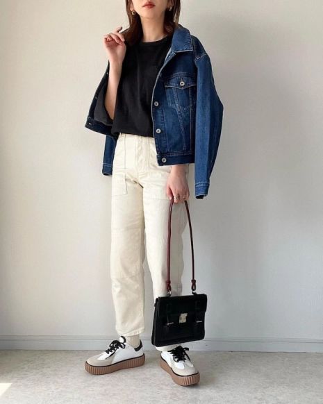 黒のトップスに白のパンツを合わせたシンプルコーデ。トップスをパンツにタックインすることで脚長効果も◎ジーンズジャケットと、おしゃれなスニーカーを取り入れることで、シンプルでカジュアルな着こなしをワンランク上のコーデに仕上げています。