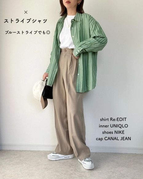 ベージュのワイドパンツに白Tシャツをタックイン。グリーンのストライプシャツを羽織れば、おしゃれなママコーデの完成です。ワイドパンツなら、ボディラインを拾わず、体型をカバーすることができます。動きやすさも抜群な運動会コーデです。