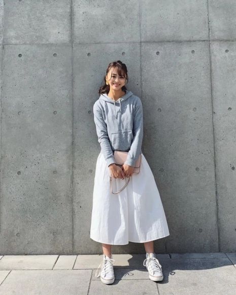 白のワンピースにユニクロのグレーのパーカを組合わせたママコーデ。足元には、ハイカットの白スニーカーをチョイスしています。プチプラパーカは運動会にもおすすめのアイテム。ワンピースと合わせることで、かわいく着こなしていますね!