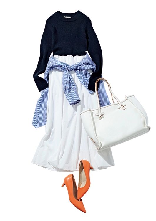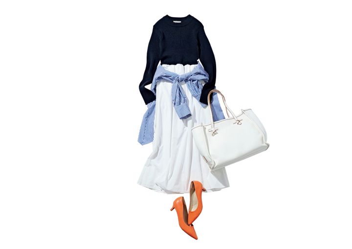 ジップニット付きワンピース(ワンピース)¥18,700/ノエラ ストライプブラウス¥8,990/PLST トートバッグ¥69,300/ジャンニ キアリーニ(ジャンニ キアリーニ 銀座店) ポインテッドトウパンプス¥7,500/オリエンタルトラフィック(ダブルエー)