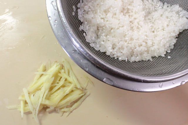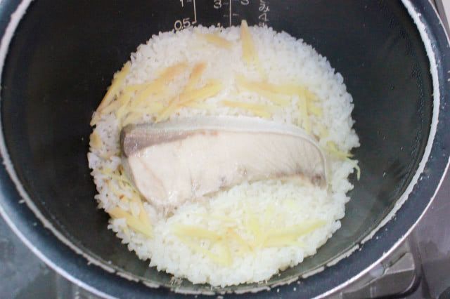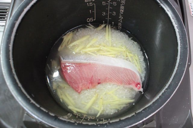 2.  炊飯器に洗ったお米、ブリ、しょうが、酒、白だし、塩、水を入れて普通モードで炊飯します。
