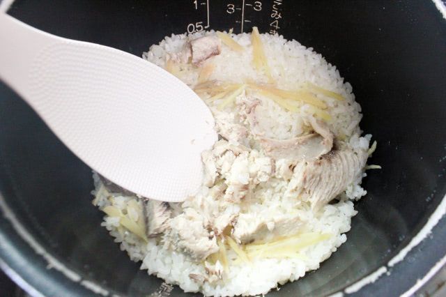 3.  炊き上がったら、ブリをほぐして混ぜ込みます。