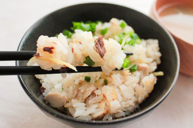 ブリの切り身に太い骨が入っていることがあるので、ほぐした時に取り除いてくださいね。皮はお好みですが、今回は取り除いて身だけを混ぜ込みました。「ブリ飯」をお茶碗に盛り、青ねぎを散らせば完成です。