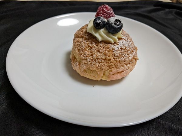 シュークリーム(テイクアウト356円)。少しフルーツ感のあるクリームがたっぷりと入っています。ラズベリーとブルーベリーがちょこんと載っているキュートな外見。人気があるのも頷けます。