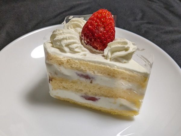 苺のショートケーキ(テイクアウト496円)。スポンジが軽く甘さ控えめでフワフワ食感。そして、何と言ってもクリームが口どけが良く軽やかなんです。