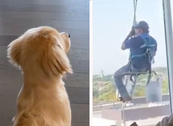 「窓の外に誰かいる〜!」宙に浮いた人を見て怯える子犬。