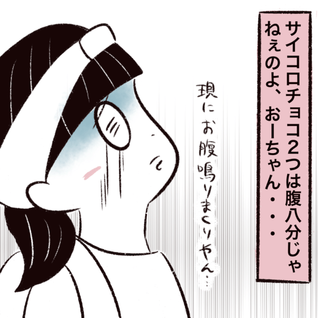 (サイコロチョコ2つは腹八分じゃねぇのよ、おーちゃん・・・。現にお腹鳴りまくりやん・・・。)