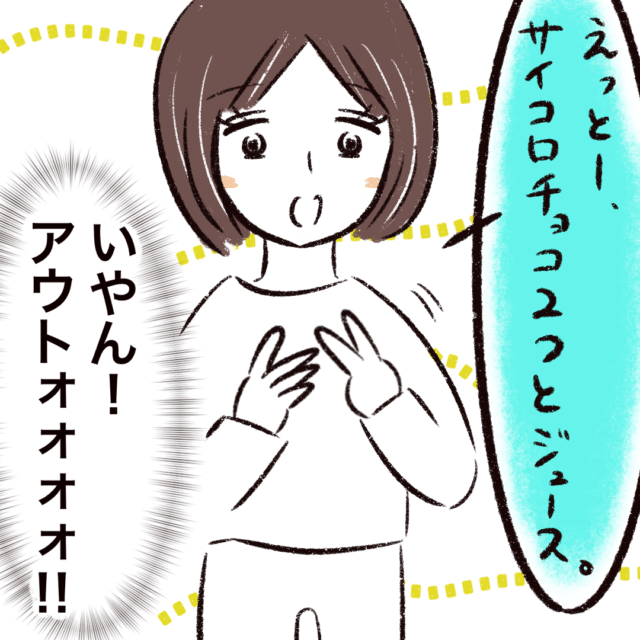 「えっとー、サイコロチョコ2つとジュース」