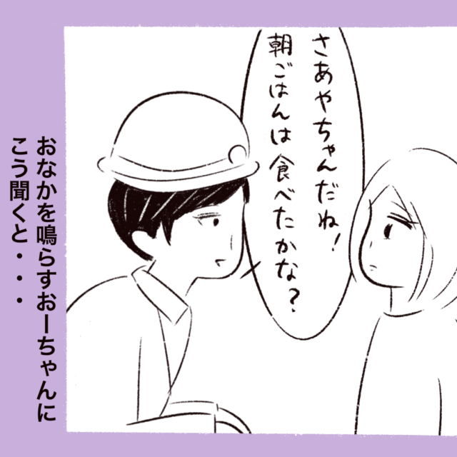 おーちゃんを保護するため2人の警察官が駆け付けました。まるさんが男性警察官に状況を聞かれている間、女性警察官がおーちゃんに優しく話しかけます。おーちゃんが名前を答えるのと同時にまたお腹が鳴り、警察官が「朝ごはんは食べたかな?」と聞くとすぐに答えないおーちゃん。しかし、おーちゃんのお腹はすごい音で鳴っていて・・・。