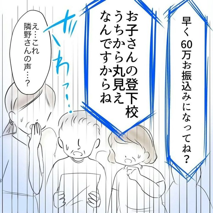 子どもを信じるのか、怒鳴り込んでくる隣人の主張を聞き入れるのか悩みながら、主人公夫婦は費用を支払う決断をします。しかし、のちに隣野さんの主張には裏があり、最初から主人公一家からお金を取るためにうその主張をしていたことが判明するのです。