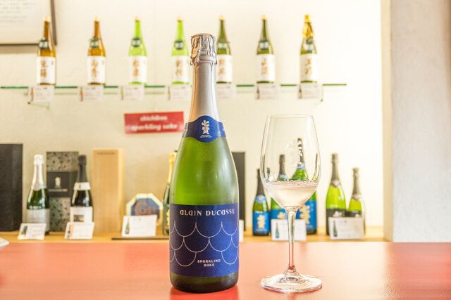 ▲ショップでは有料の試飲も楽しめます。写真は「アラン・デュカス スパークリング サケ」