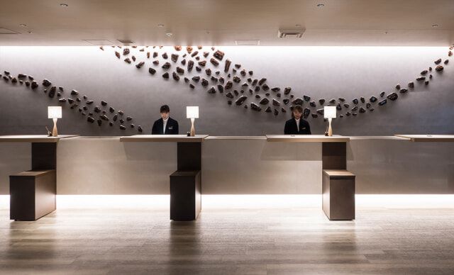 ▲壁のアートが印象的なモダンなフロントでチェックイン