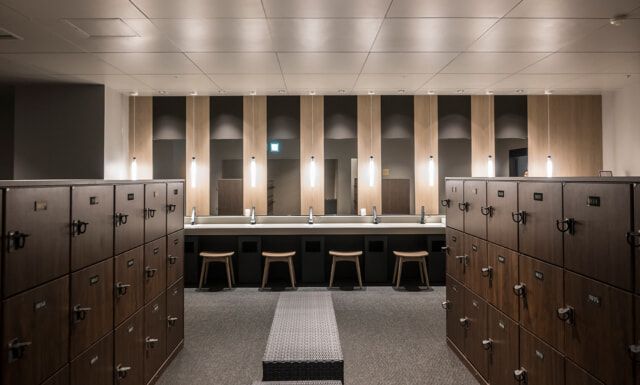 照明にこだわったお洒落な脱衣場。タオル類は置いていないので、客室から持参します。大浴場の入口には鍵付きのスリッパ用ロッカーもあるので、自分のスリッパがわからなくなることもありません。