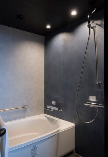 広いバスタブを備え、黒いアクセントウォールやスポットライトで雰囲気を出しています
