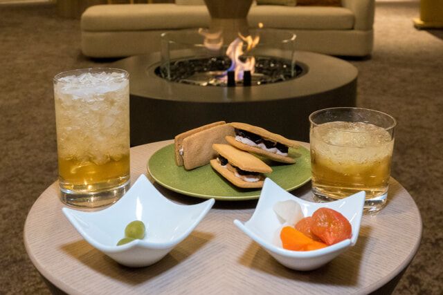 ラウンジに設けられたファイヤーピットを囲みながら、夜のドリンクサービスを満喫。つい長居したくなるラウンジです。