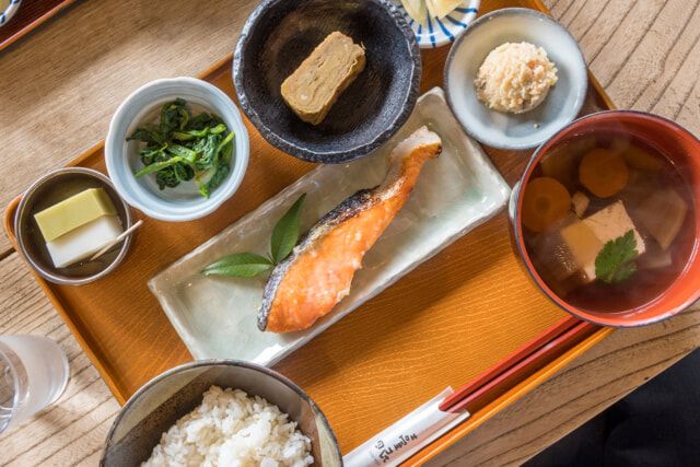 七賢で磨かれた発酵の技を駆使した発酵料理のお店では、ランチに「鮭の麹づけ定食」をいただきました。日本酒の仕込み水を使い、酒造り用の甘麹で20日間漬け込んだ鮭の麹漬けは身がふっくら。麹の優しい香りも感じられ、押し麦を使った麦ご飯が進みます。田舎汁は根菜や鶏肉、お酒も使われコクもプラス。ひと口ひと口味を確かめながらいただきました。