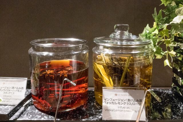 ホテル自家製のインフュージョン(漬け込み酒)は、ぜひ味わっておきましょう。この日はバーボンをベースにシナモンとスターアニスの漬け込み酒と、ウォッカベースにレモングラスとローズマリーの漬け込み酒を用意。ジンジャーエールや炭酸で割ると想像以上に美味しく、油断するとどんどん飲んでしまいます。