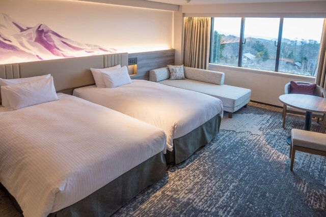 アサインされた客室は、リブランドに合わせてリニューアルされた「スーペリアツイン 」。天気が良ければ富士山や北岳、間ノ岳など、日本の最高峰ベスト3の山を眺望。さらに南アルプスの山々や韮崎市の街並みなども見られます。条件が合えば富士山と日の出の共演も見られるので、年末年始は特に人気の客室です。