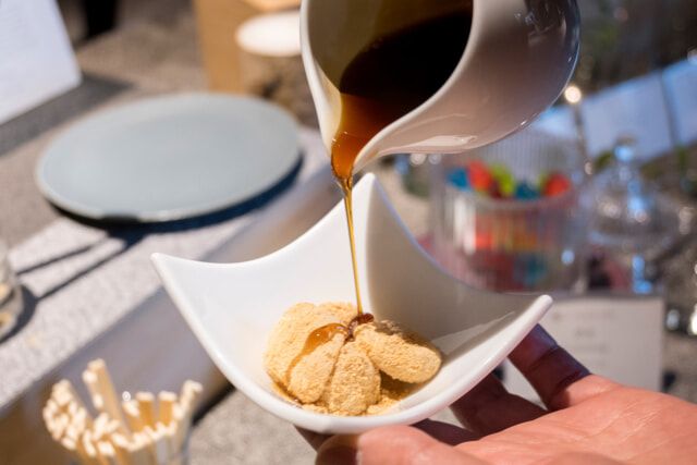 武田信玄が出陣の際、非常食として持参したと伝わる「信玄餅」。ラウンジには北杜市の旧甲州街道沿いに店がある「金精軒」の信玄餅を用意。厳選された餅米粉と砂糖、きな粉などをシンプルに使い、保存料や防腐剤を使わず昔ながらの味を楽しめます。