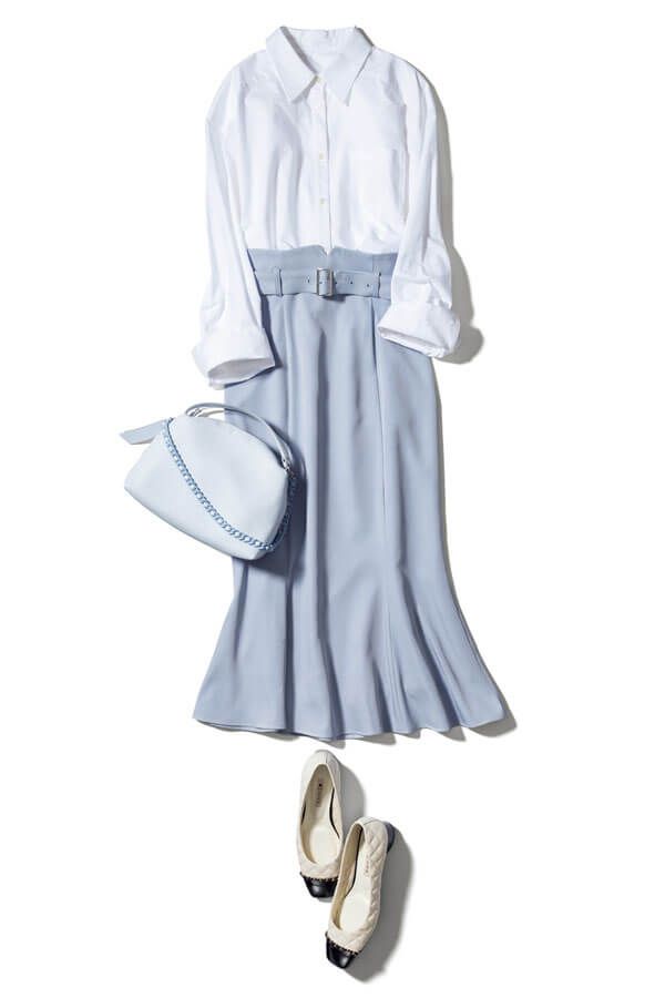 糖度高めなマーメイドスカートは、定番の白シャツ合わせでお仕事ムードをほどよくアップ。