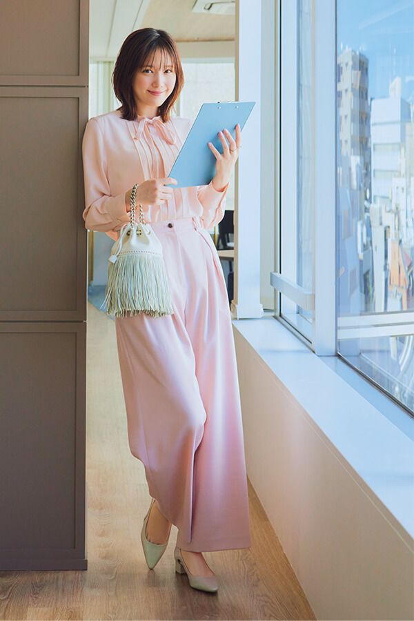 ロマンティックなピンクのワントーンで、きれいめパンツコーデに季節感を。淡いトーンのピンクなら、ベーシックカラーのように使えて優秀。オフホワイトの小物でカラーコーデを品良く引き立てて。