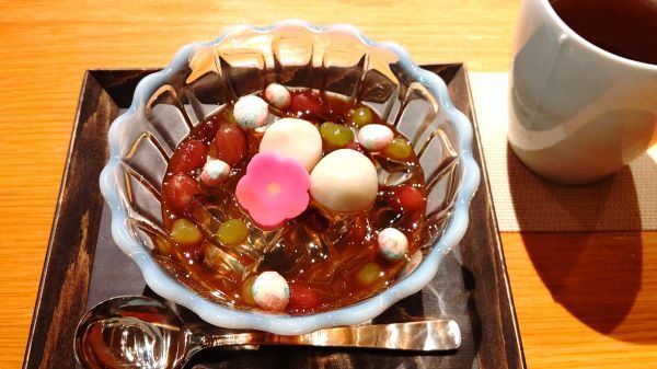 カフェ 加賀麩不室屋では展覧会にちなんだメニュー「水ゼリー~加賀棒茶蜜がけ~」(1,210円、税込)をいただきました。 初夏の少し暑い日に、涼し気な見た目とさっぱりしたほどよい甘さの水ゼリーは丁度よいスイーツです。 加賀棒茶とのセットドリンク(350円、税込)もお薦めです。 ※販売期間2024年4月16日(火)~6月16日(日)