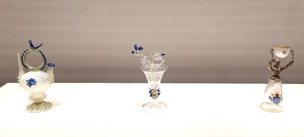 右から、乙女の杯 ドイツ 18世紀、鹿形パズルゴブレット ドイツ 17~18世紀、レースガラス・カンティール スペイン 17~18世紀 全てサントリー美術館蔵 通期展示