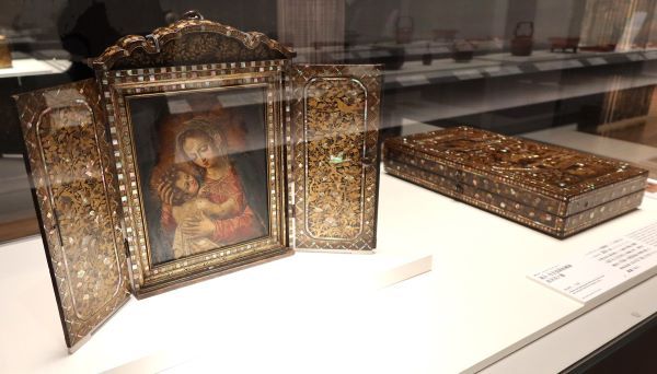 幼子イエス・キリストを抱く聖母マリアの優しい眼差し。 聖龕(せいがん)とは聖画を納める厨子(ずし)のことだそうです。本作は西欧に輸出された「南蛮漆器(なんばんしっき)」です。