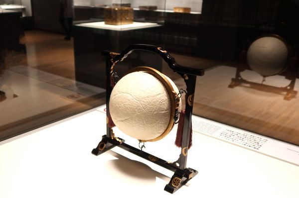 《鞠・鞠挟》。不思議な存在感を放つ丸く白い物体と黒漆塗の架台。ハテ?これは…と足を止めて見入ってしまいました。 平安(へいあん)時代後期以降、貴族文化として継承された蹴鞠(けまり)で用いられた鞠と、鞠挟だそうです。