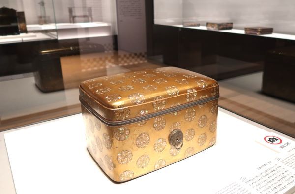 国宝《浮線綾螺鈿蒔絵手箱》。 表面は金粉を密に蒔いた沃懸地(いかけじ)。細やかな螺鈿細工の円形の浮線綾紋(ふせんりょうもん)がきれいに並びます。