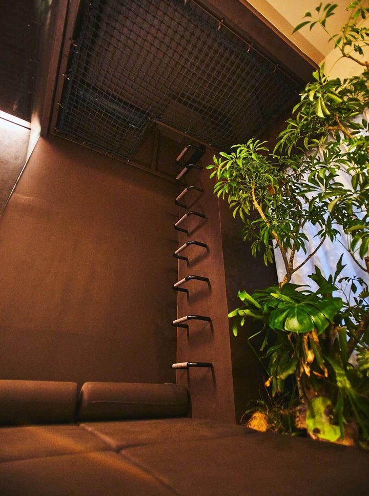ベッドサイドのはしごを上ると天井にハンモックが。秘密基地のような仕掛けにワクワクする