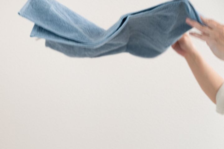 脱水後のタオルを数回振りさばくだけでも、水分量を減らすことができます。パイルを立たせることにもなるので、ごわつきの防止にも。