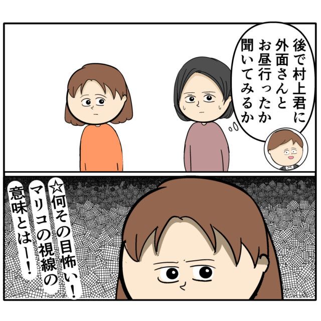 席を外したり戻ったり、少し間隔をずらして同じことを繰り返す良し男さんとふり子さんの真相を確かめようと席を外した2人を追ったマキさん、廊下で2人並んで話している姿を目撃し「一緒にいる!まだ確定じゃないけど休憩する時間を作ってる?」とますます怪しいと思っているところ、その一方で「これは問題だな」と新たな何かが動き出していて・・!