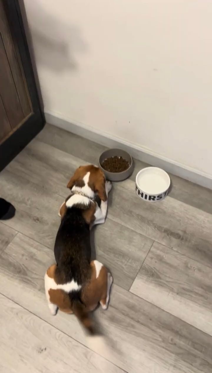 3. 「お座り」と「伏せ」でごはんをじっと我慢するビーグルの子犬。しかし、こっそり・・【アメリカ・動画】
