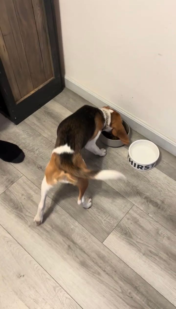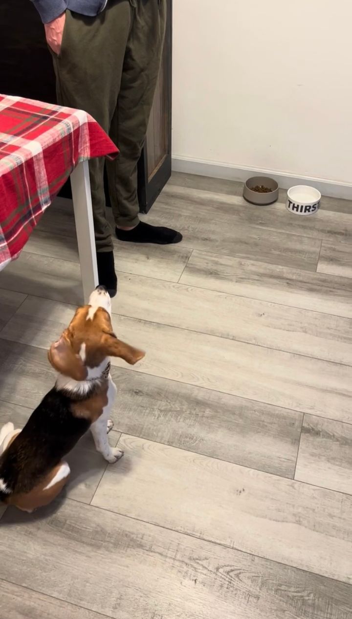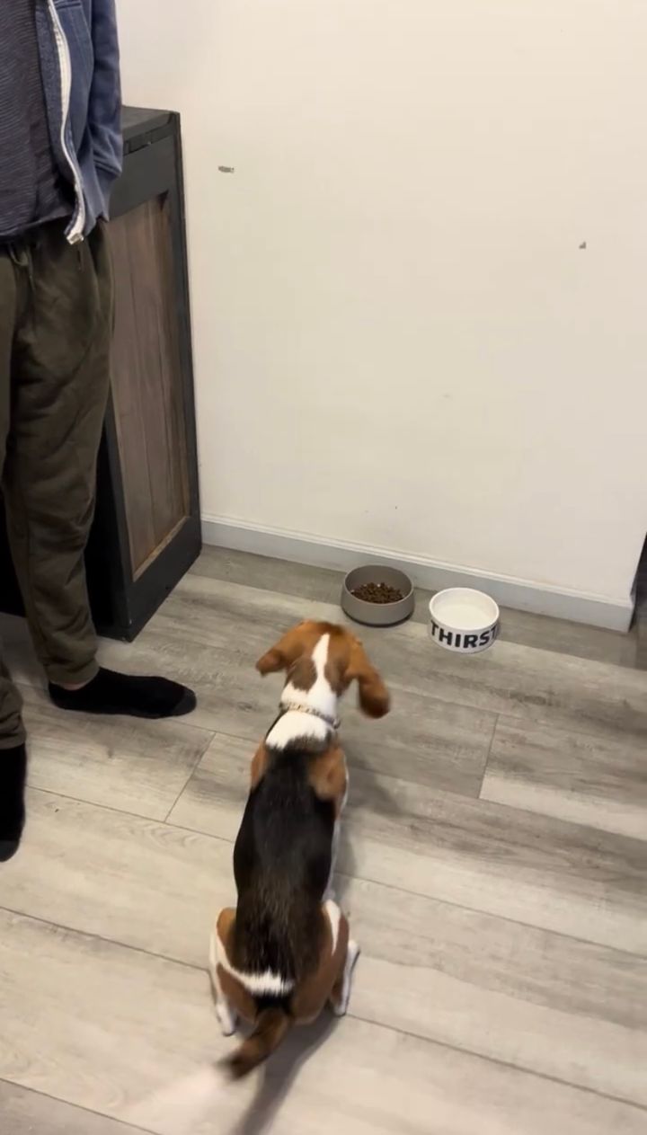 ごはんに飛びつきたいのを我慢するビーグルの子犬。 訓練中のその姿は、こちらの動画からご覧いただけます。